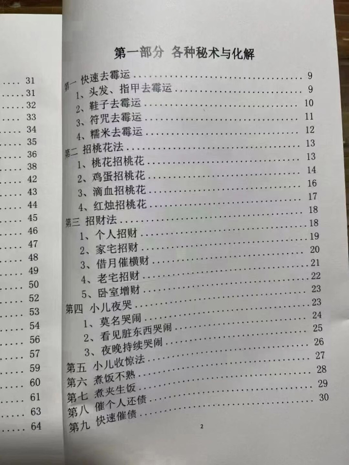 中枢本体分为三大板块,丰富全面且针对性极强。第一部分聚焦种种秘术与化解,涵盖糊口全场景需求:既有快速去霉运、招桃花、招财等运势晋升类秘术,也有赤子收惊、一碗水祛病、止血神法、九龙化骨水、专治腹黑病等健康看守类技法,更包含鸡蛋化灾、捉蛇法术、封血接骨、治怪病法、龟龄不生病等济急与崇敬秘术;同期收录催债法、破解迷魂法、驱赶阴东谈主法等实用技法,亦有整治仇东谈主法等警示性本体,呼应开篇向善认识。