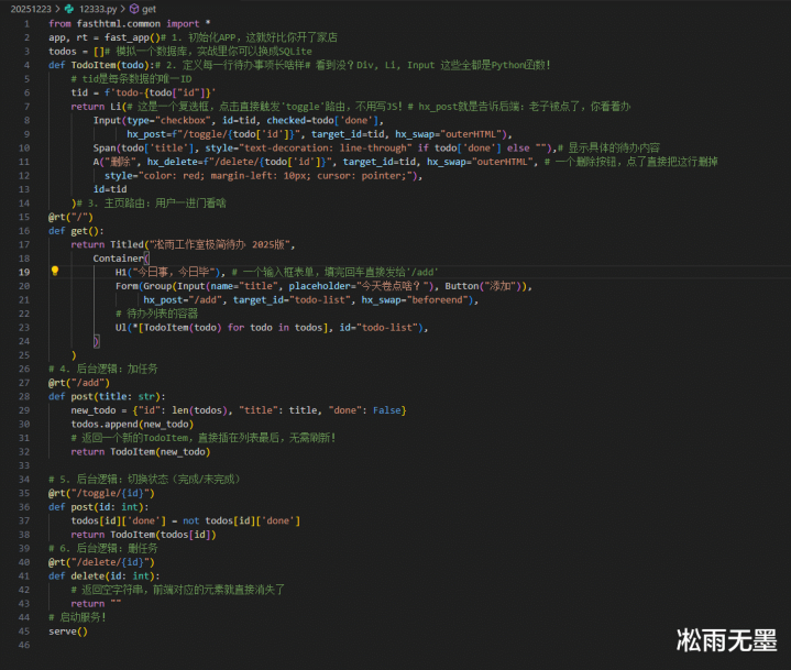 2025年了,Python终于思通了。昔日为了写个网页,你得Django套Jinja2,大要FastAPI配React,两端受气。当今?FastHTML平直把HTMX给封装进去了,让你用Python逻辑平直截至前端交互。不需要前端!不需要前端!不需要前端! 弥留的事情说三遍。